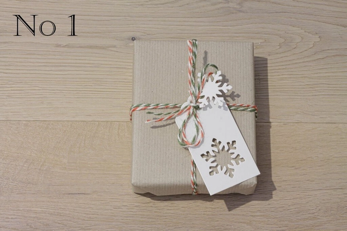 Natural Kraft Paper, Red and Green Twine and White Gift Tag with Snowflake